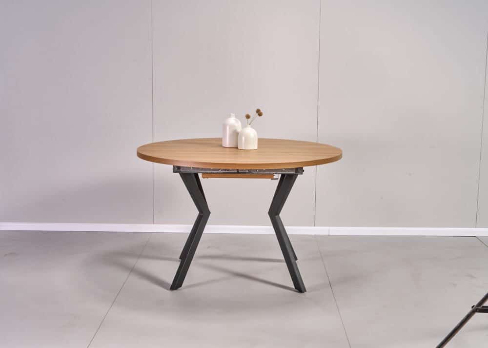 השולחן בקוטר 1.20 מ’ בעל הארכה של 40 ס”מ נוספים וקוטר מלא של 1.60 מ’.