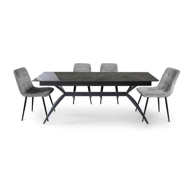 שולחן האוכל עשוי MDF בציפוי למינציה דמוי שיש שחור מבריק, ורגלי השולחן עשויים ממתכת עם גימור צביעה אלקטרוסטטי נגד חלודה בצבע שחור.